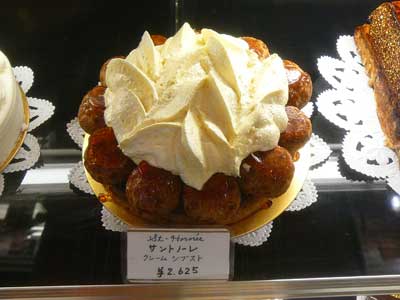 | 本来のサントノーレは、パイの土台に飴がけしたプティ・シューを飾ったアントルメです。 | |