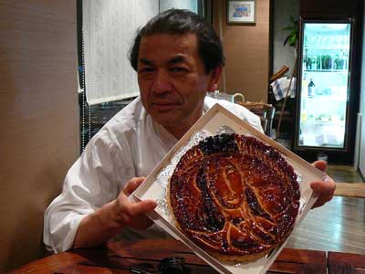 | 「本来はバンド状のガレットだったガレット・セルパンティーヌを蛇の形にアレンジして、ヘビ年の干支のガレット・デ・ロワとして再生したガレット・デ・ロワ・セルパンティーヌです。このような過去の遺産は遺産として守り、古典菓子や伝統的な地方菓子の火も絶やさぬようにすることも必要なのです」 | |