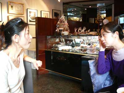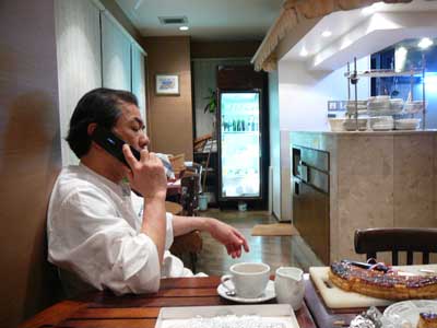 | ここで平岩理緒さんが登場。「あれ?理緒ちゃん、クープ・デュ・モンドの取材でフランス大使館に行ったんじゃないの?」「大森先生、それがフランス大使館に着く直前に『ラトリエ・ド・シマで間もなく新しいガレット・デ・ロワが誕生するから直ちに急行せよ』っていう怪メールが届いて…島田会長が3月にガレット・デ・ロワ!?…って気になって、こっちに来ちゃったんですよ」「あ、そのメール、私にも届いた」 | 「実はそのメールを送ったのは私なのです。あの平岩理緒さんがクープ・デュ・モンド・ドゥ・ラ・パティスリー日本国内予選の結果発表と表彰式をすっぽかしてまで見に来た“新しいガレット・デ・ロワ”とは…(^-^)//(()トトトトト…」 |