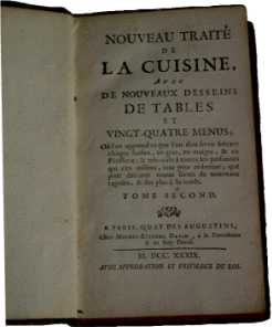 | 「ムノンの『新料理概論』(Nouveau traite de la cuisine)なら私も見たことがあります。紀伊国屋書店の西洋稀覯書展で初版を168万円で売っていました(:゚-゚)//(()ドドドーン\1680000」「これは2巻本で1739年に第1巻、1742年に第2巻が出されました。この本にはフランソワ・マランの『食道楽の神コムスの贈物』の強い影響が見られます。次いで1746年に『簡単で安く、しかもきわめておいしい料理の作り方を順序よく集めた書』と銘打った本がギラン書店から出されました。これは『ブルジョワ家庭の女料理人』(La Cuisiniere bourgeoise)と題されており、オルムソン(ヴァル・ド・マルヌ県)の女性町会議長の家の料理人ブラン夫人が書いたものだと言う人たちもいましたが、それは間違いで、やはりムノンの著作であり、19世紀後半に到るまで版を重ねることになりました。ムノンはその他に5〜6冊の本を書いていますが、とりわけ1755年に発表した高級料理の書『宮廷の夜食』(Les Soupers de la Cour)で名声を博しました。この本には次のような副題が付けられています。『四季に応じて最高の料理を供するためにあらゆる種類の食物を調理する術』(Ou l'art de travailler toutes sortes d'aliments, pour servir les meilleures tables suivant les qurtre saisons)。これは1755年にユイラン書店から4巻本で出されましたが、1778年にL・セロ書店から3巻本の新版が出されています」 | |