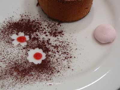 | 「そして、『中身が連想できるように、使用したフルーツでデコレーションする』。これはクレーム・ピスターシュの中にグリオット・チェリー」 | |