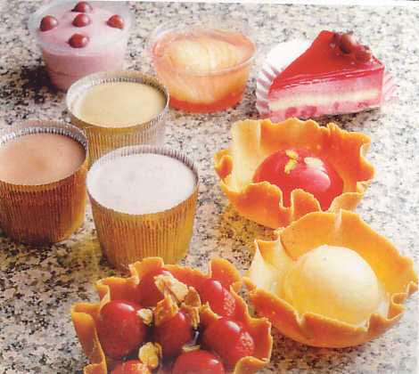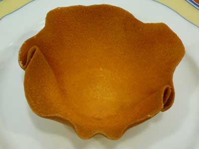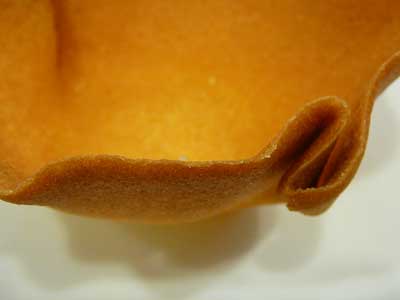 | パータ・チューリップは、バターに卵白、粉糖、粉類、バニラエッセンスを混ぜた生地です。これを直径12cmの円形に薄く焼いて、熱いうちにお碗か小さなボールの底で型取って成形します。 | |