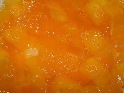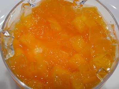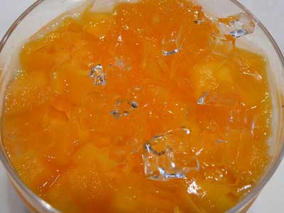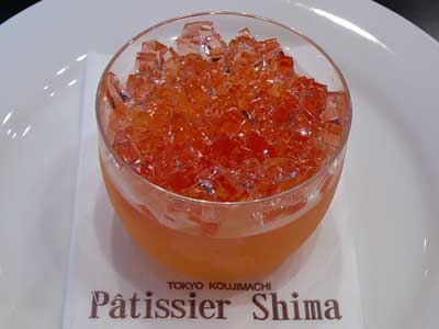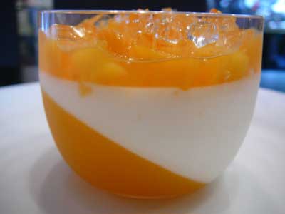 | 一番上にある透明なキューブは白ワインのジュレです。 | マンゴーのキューブが姿を現しました。 |