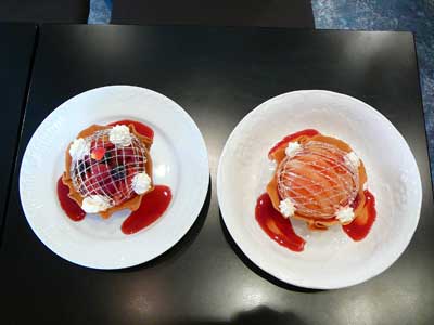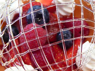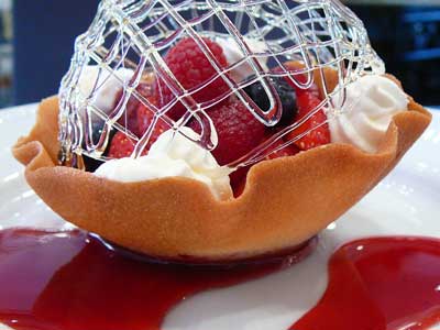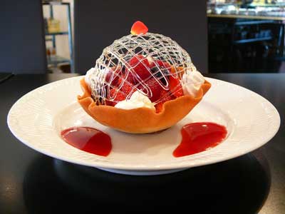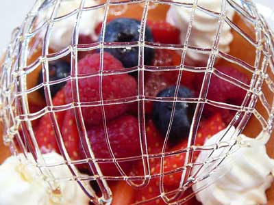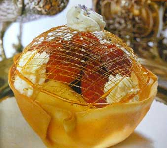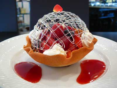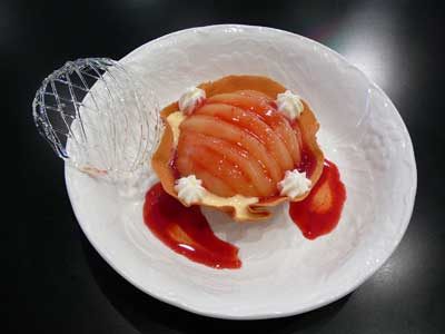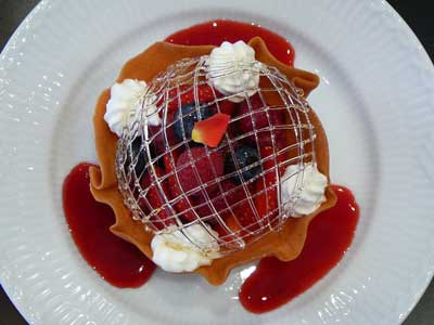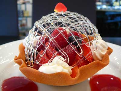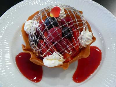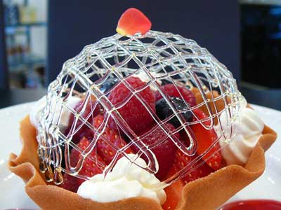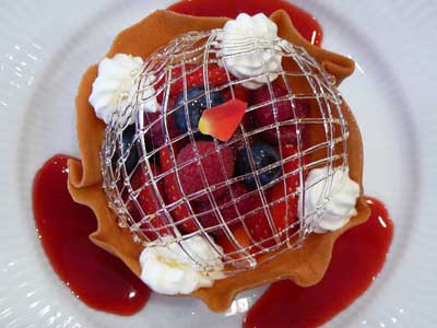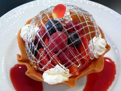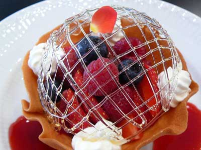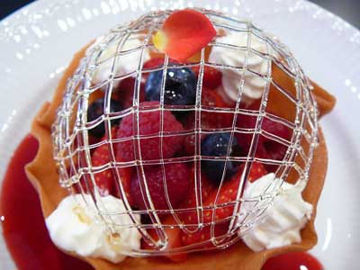 | 今にも折れてしまいそうな細い飴の糸のドーム。そしてバターの香りが豊かに漂うタンバルの器の中には、赤い果実が盛り込まれています。 | |