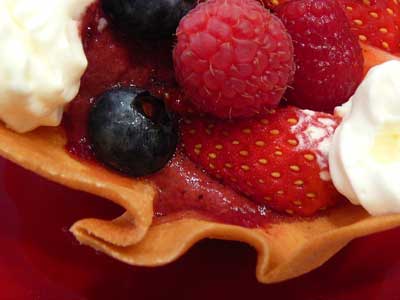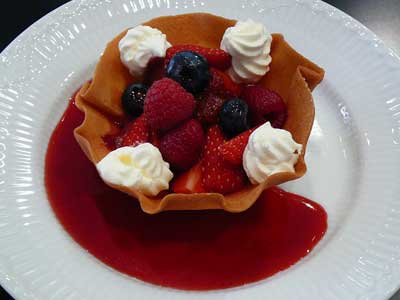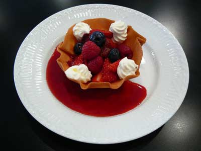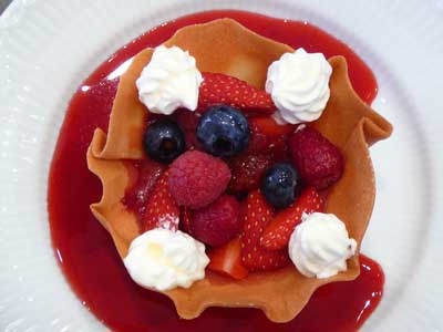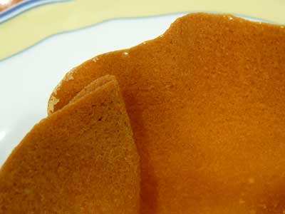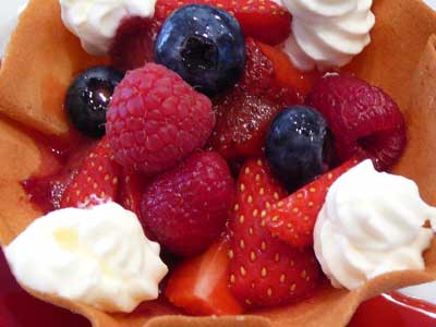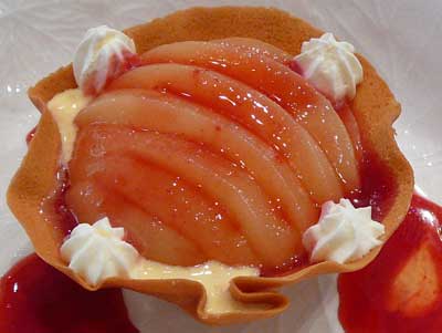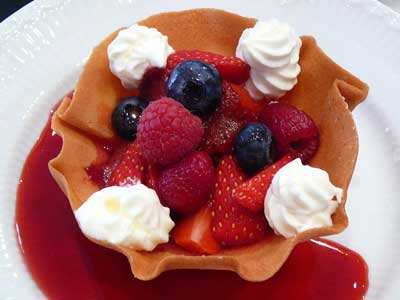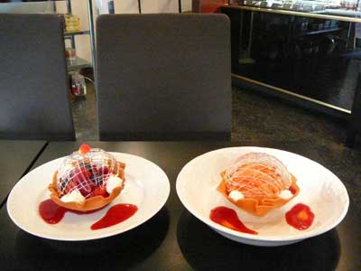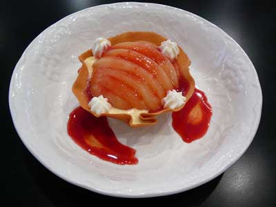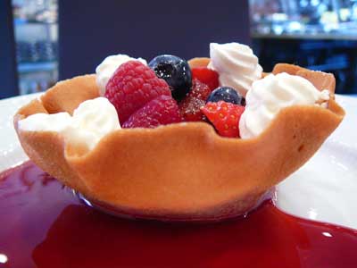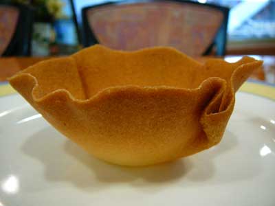| これが「クロッキニョル」とか「パータ・チューリップ」と呼ばれるタンバルです。薄焼きのラングドシャクッキー生地なので水分に弱く、テイクアウトには不向きです。 | |