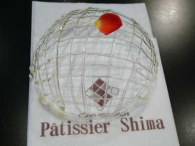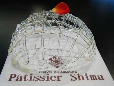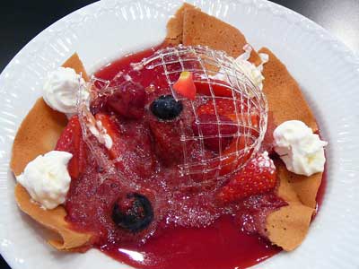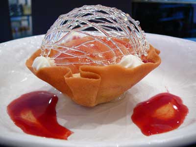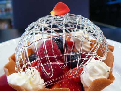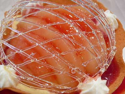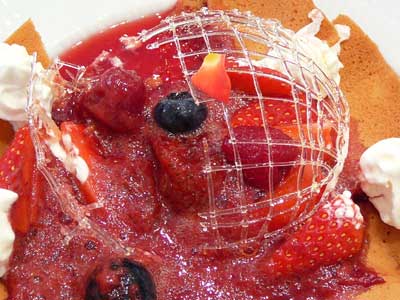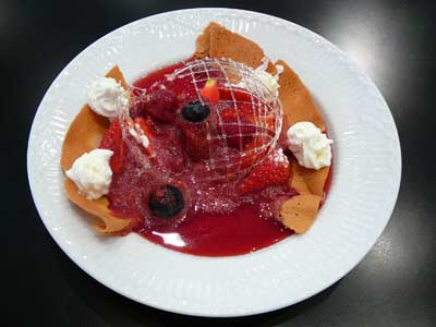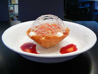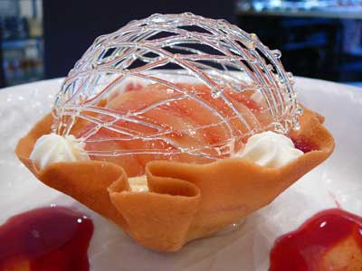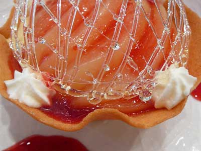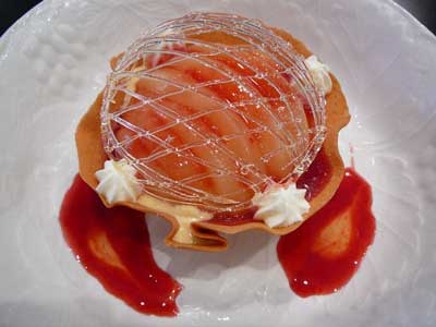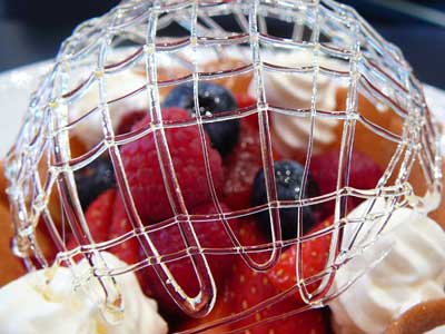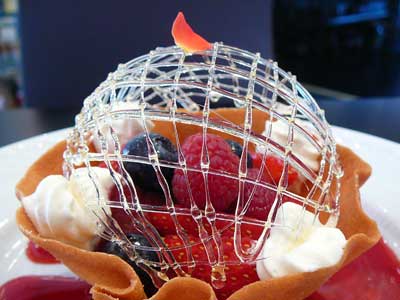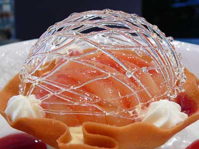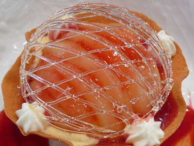 | 今にも折れてしまいそうな細い飴の糸のドーム。これはテイクアウトには向きません。レストランのデザートなのです。 | |