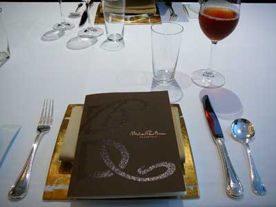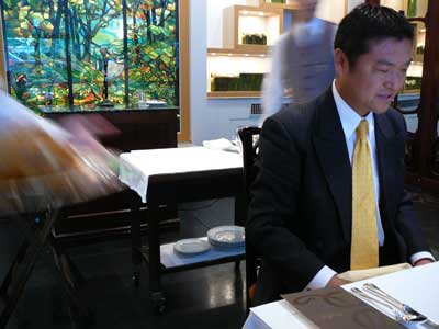 | 一流と呼ばれるフランス料理店には極めて洗練されたサービス美学があります。多くのサービスマンを擁するグランメゾンの場合、彼らは一見、同じ仕事をしているように見えて、実は制服別に役割分担が決まっています。初めにメニューを持って来るのはメートル・ド・テル。 | |