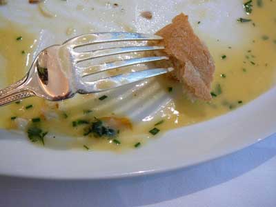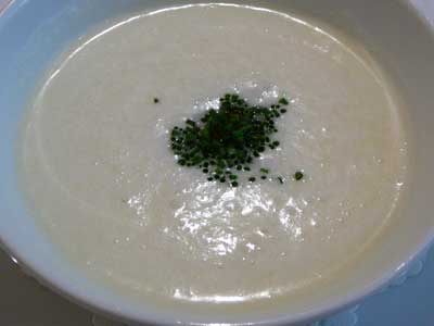 | トロリとした感触のスープだからバケットの歯触りがよく合います。ヴィシソワーズはスープとはいうものの材料の内容が豊かなものを使っているので栄養満点なのです。 | |