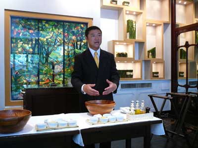| メートル・ド・テルの中にも経験と技量に応じた格付けがあり、サービスマンピラミッドの頂点に立つのがプルミエ・メートル・ド・テル。プルミエ・メートル・ド・テルの中でも頂点に立つ人が本日の昼食会の講師 田村敏郎さんです。田村さんはマキシム・ド・パリで24年間サービスの第一線で活躍後、2005年、株式会社ひらまつ入社。現在はポールボキューズブランドの日本総支配人として全店舗を統括しています。1998年に「第5回メートルドセルヴィス杯」で優勝するなど数々のサーヴィスコンクールで受賞歴を持ち、2001年にはサービスマンの地位向上を目指した「メートル・ド・セルヴィスの会」を発足。会長に就任し、各種団体や協会でも精力的に活動を展開。美しいサービスとユーモア溢れるトークセンスは日本国内では右に出る者はいません。 | |