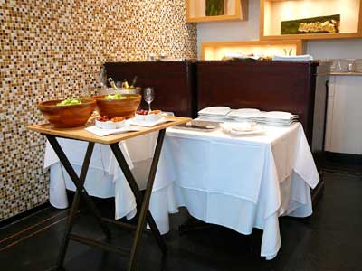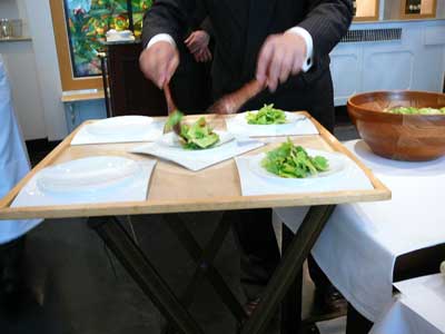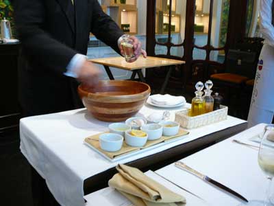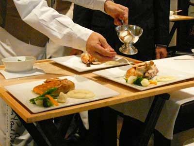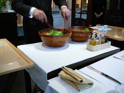 | 厨房からゲリドン(サイドテーブル)へ食器や料理を運んでくるのはコミ・ド・レストラン。客に給仕するのはシェフ・ド・ランの仕事です。つまりメートル・ド・テルを筆頭に、補佐役のシェフ・ド・ラン、コミ・ド・レストランと3人のチームワークでサービスが行われるわけですが、そこには明確な序列があります。 | |