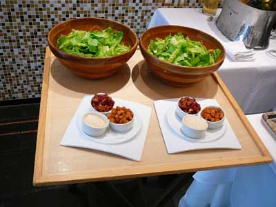 | シーザーサラダが誕生したのは1924年7月14日の暑い夜のことでした。ハリウッドからの客が、大挙してメキシコ・ティファナのホテル「シーザーズ・パレス」に押し寄せてきたのです。禁酒法真っ盛りの時代、パーティーのためにハリウッドから国境を越えて人がやってくることは珍しいことではありませんでしたが、その日のシーザーズパレスのレストランでは、ほとんどの材料が底をついてしまい、この大勢の突然の客をもてなすには全く足りなかったのです。このレストラン・ホテルのオーナーである、シーザー・カーディーニは、悩んだ末に、カートにレタス、ガーリックオイル、レモン、卵、パルメザンチーズ、ウスターソース、クルトンとコショウを載せて、客のいるダイニングの中央に進みました。そして、鮮やかな手つきで材料を混ぜ合わせ、一つのサラダを作り上げたのです。そしてこのサラダは、一夜にして伝説となり、西海岸に、全米に、そしてヨーロッパにまで広がっていったのです。 | |