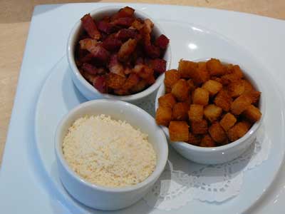 | 「シーザー・ドレッシングにロメインレタス、ベーコン、クルトンを入れて、よく混ぜ合わせます…」 | |