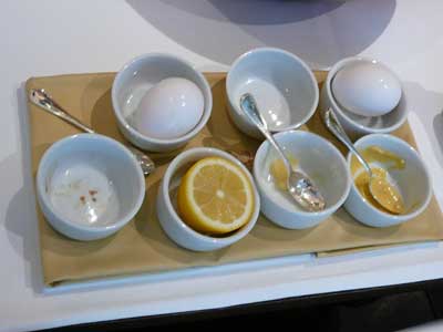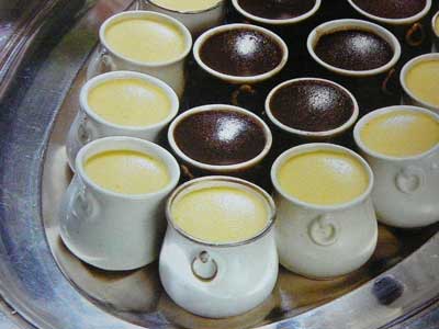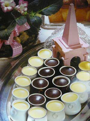 | これがポール・ボキューズのクレーム・ブリュレの元になったピラミッドのポ・ド・クレーム(壷入りクリーム)です。ちょっと前に流行した“やわらかプリン”と同じものですが、同じようなものが1930年代にフェルナン・ポワン氏によって作られていました。元々は、家庭でお母さんやお祖母ちゃんが作っていたお菓子ですが、素材や配合の妙で3つ星レストランのデザートにも成り得るのです。ピラミッドでは(左の写真奥に写っている)ブリオッシュと一緒にサービスしていました。 | |