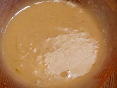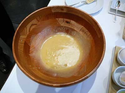 | 卵に調味料、レモン、ガーリック、アンチョビ、溶きガラシ、オリーブオイル、サラダオイルなどを混ぜ合わせてシーザー・ドレッシングを作っております。 | |