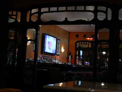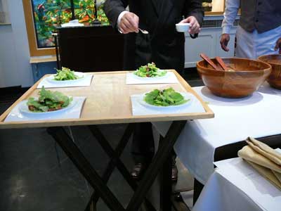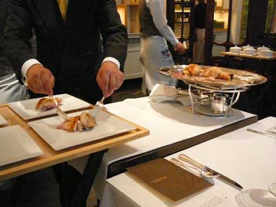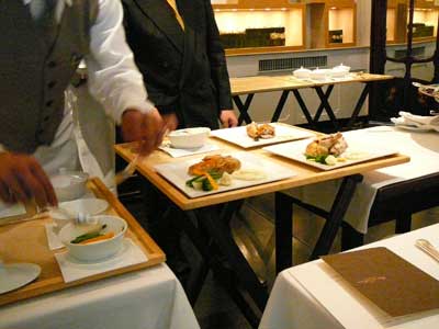 | コミ・ド・レストランが厨房からゲリドンまで料理を運んできて、シェフ・ド・ランが「ワンダフルハウス様、“冷たいスープ ヴィシソワーズ シェリー酒風味のゼリーと共に”でございます」と給仕してくれるわけです。 | |