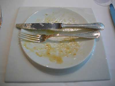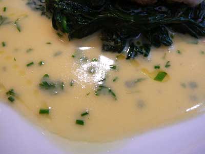 | 塩焼きがフレンチに変身するブールブランソースは主に魚料理に使われるソースです。みじん切りのエシャロットを白ワインで煮詰め、バターと香草を加えて作ります。残ったソースは、ちぎったパンをフォークに刺して拭きながらいただきます。下げたお皿にソースが一滴も残ってないとシェフが泣いて喜ぶそうです。 | |