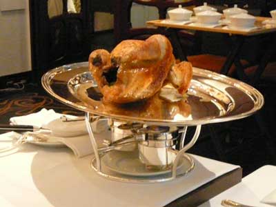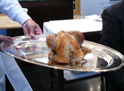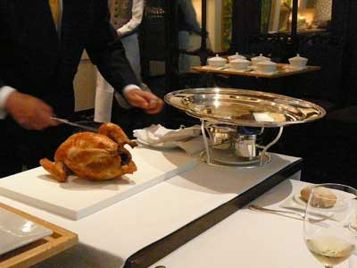| レショー(料理保温皿)に載せられ、頭の方からプレゼンテーションされた福島県の地鶏「伊達鶏」。フランスのブレス鶏を日本人に合うように改良したもので、 肉質が柔らかいのが特徴です。 | |