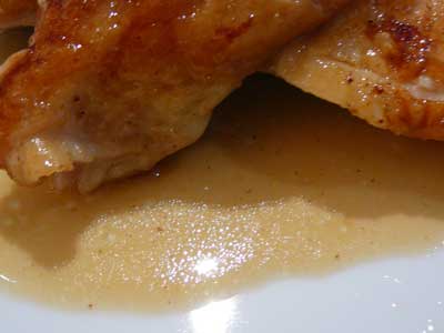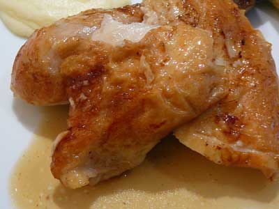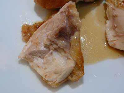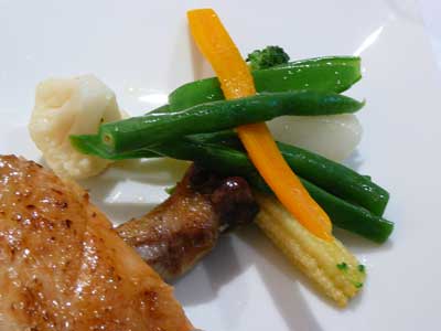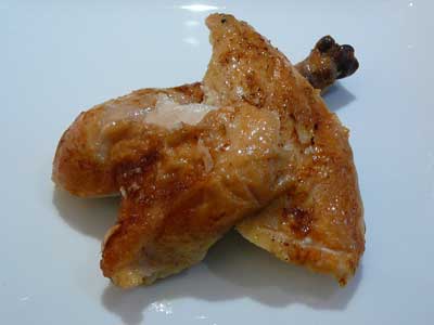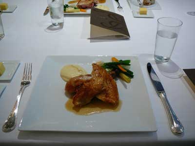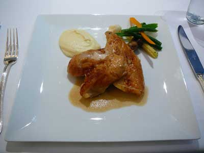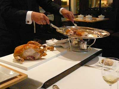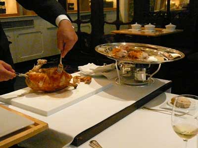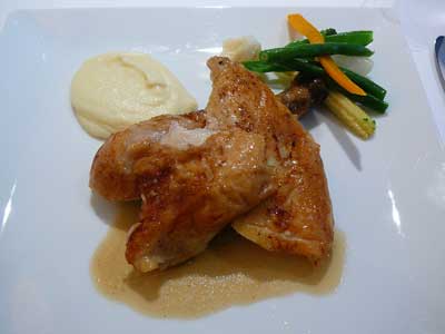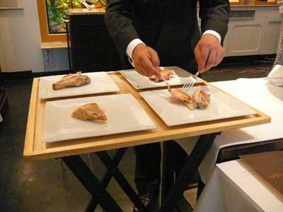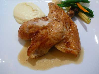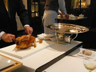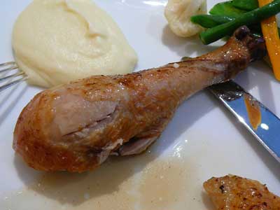 | コース・ポーションの場合は1羽を4人前に切り分けるようです。丁寧にアロゼされているので、表面がカリッとした感じに仕上がっています。 | |