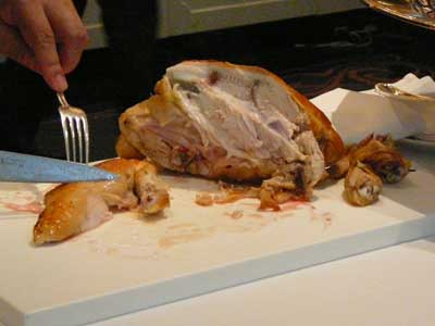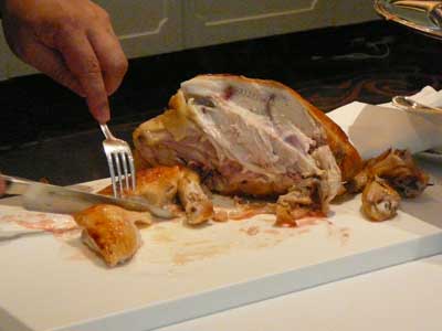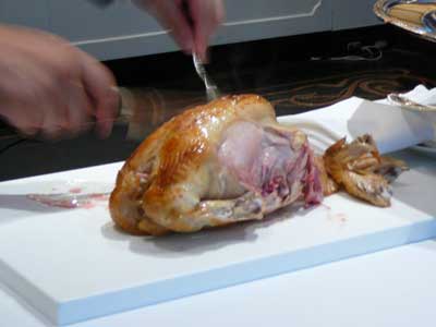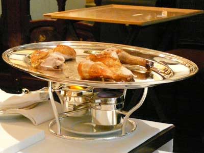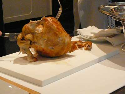 | (鶏の陰になってしまって見えませんが)反対側の腿もフォークで押さえ、骨と平行にナイフを入れて切り、レショー(料理保温皿)に載せます… | |