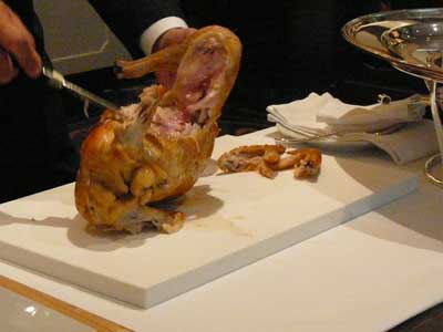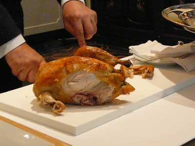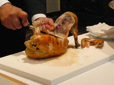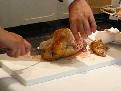 | 同様に反対側の腿もはがします。鶏のデクパージュのポイントは、腿をはがす所で、腿に刺すフォークは深さと角度に気をつけ、はがす時に胸肉を傷つけないようにしなければなりません。腿はナイフで切り落とすのではなく、はがし取るような感じに。ナイフの切り口を見せず、はがれたままの状態でサービスする方が腿肉の歯ごたえが生きるのです。 | |