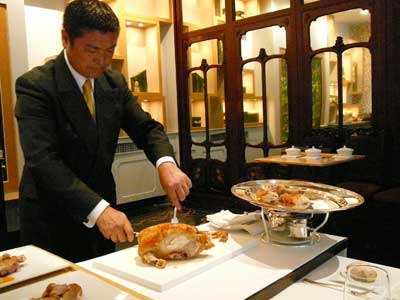 | デクパージュはあくまでも、「料理を最高の状態で味わってもらう」のが基本原則。温かいうちにサービスしなければならないため、スピーディーさが要求されます。また、カッティングの断面や盛りつけなどの視覚的な美しさも当然必要。そのため、無駄のない手さばきが望ましく、必然的にさばく手順や使う器具類も決まってきます。場数を踏み、経験を重ねたメートル・ド・テルのテクニックは、機能を追求した末に生まれる洗練された美も併せ持っています。この美しいサービスこそが料理のトータルの演出となり、味の仕上げに一役買っているのです。 | |