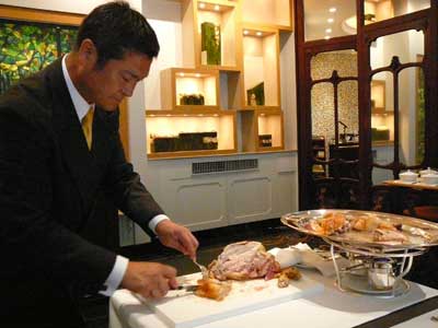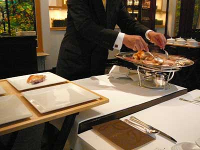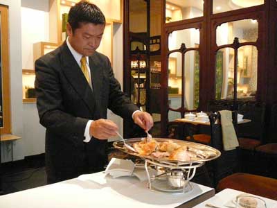 | ついに、マキシム・ド・パリでフランス料理のサービス・テクニックを極めた田村総支配人が熟練の技を見せてくださる時がきたのです。 | |