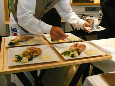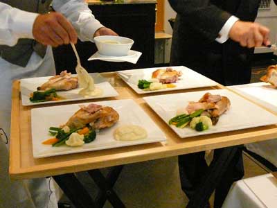 | 田村総支配人が2羽目のデクパージュをしている間、シェフ・ド・ランがマッシュポテトとソースを盛り付けています。 | |