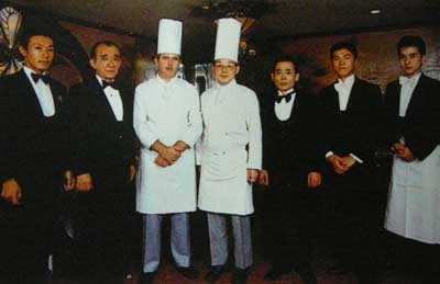 | 左の写真は1984年当時のマキシム・ド・パリ。左からソムリエ鈴木実氏、ディレクトール秋山隆哉氏、フランス人料理長ダニエル・パケ氏、日本人料理長 浅野和夫氏、プルミエ・メートル・ド・テル奥村正義氏、シェフ・ド・ラン田村敏郎氏、コミ・ド・レストラン小川二郎氏。服装はマキシムの場合、ソムリエはスペンサージャケットに黒い蝶タイ。ディレクトールは昼ダークスーツ、夜タキシード。プルミエ・メートル・ド・テルはテールコートに黒い蝶タイ。シェフ・ド・ランはテールコートに白い蝶タイ。コミ・ド・レストランはスペンサージャケットに白い蝶タイに白前掛け。 | |