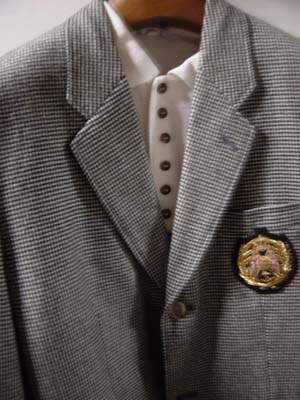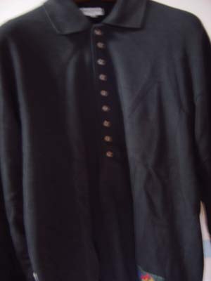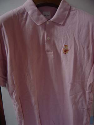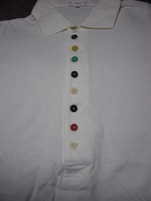 | 1990年春夏物(長袖)¥9500 カジュアルさは微塵も無い。ジャケットやスーツに合うシックなポロシャツ。これ1枚で着てもサマになります。 | 裾に付いてるラベルはシーズンごとに違うデザインで、ポール氏の遊び心が窺われます。 | 1989年春夏物(半袖)¥8500 普通のポロシャツだとボタンが2〜3個しかないので、ジャケットのインナーとして着た場合、Vゾーンの下部が間延びした印象になってしまいますが、これは御覧の通り、Vゾーン全体にボタンが等間隔に配置されていて、バランスが良く、優美な印象を与えています。 |