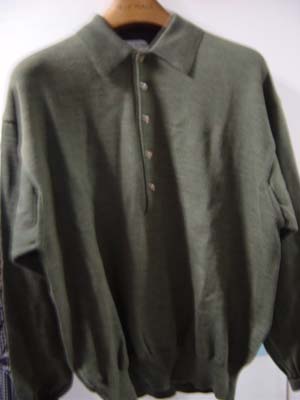 | 1990年春夏物(半袖)¥8500 ポールスミス・ジーンズのデビュー・シーズンの作品。珍しいマルチカラーボタンで、紺のスーツに合わせると映えます。 | 1990年秋冬物¥25000 5つボタンのウールのポロカラーセーターはこの年だけ作られた貴重品。茶のツイードのジャケットに合わせるとパリの芸術家になった気分。 |