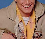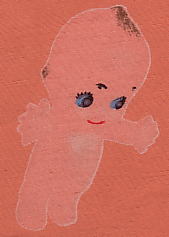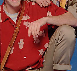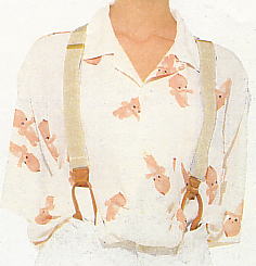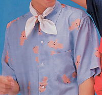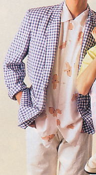 | モデルはジョディ。ショートパンツとサスペンダーで少年のような着こなし。 | 1枚仕立てのコットン・ギンガムジャケット(ベースボールワッペン付き)¥26,000、ホワイトジーンズ¥16,000 モデルは、当時メンズクラブ専属で、現在は俳優の神林茂典さん。 | 光沢のある水色。柄は見えないが、首に巻いたスカーフ(¥3,000)もキューピー柄である。モデルは、当時人気のあった高橋兄弟。 |