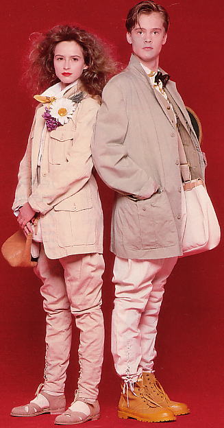 | 左・ブラウス15,000円、ジャケット25,000円、パンツ14,500円、革ショルダーバッグ62,000円、綿ショルダーバッグ8,000円、サンダル31,000円、ソックス2,900円、雛菊コサージュ8,800円、菫(スミレ)コサージュ10,000円、バンダナ2,800円(ピンクハウス1989年春夏物) 右・パンサープリントシャツ(半袖)19,500円、ジャケット39,000円、コットンジョッパーズパンツ17,000円、ベスト29,000円、パンサー柄チョウタイ8,600円、ショルダーバッグ12,000円、ワークブーツとサファリハットは参考商品(カールヘルム1989年春夏物) アンアン1989年2月3日号(No.661)広告「春の服、咲いた。」 |