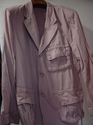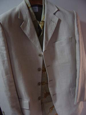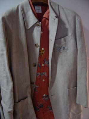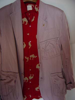 セットアップのパンツもあるので、全身砂色のコーディネートの完成。普通のテーラードジャケットでも、シャツの柄でサファリテイストを表現することが可能になるのです。金子さんは上記の「いいものみつけた」で、砂色を楽しむには9月がいい、と言ってますが、私ワンダフルハウスは、今の時期(4月)のほうがベージュの気分なのですが、皆さんはどうでしょうか? 麻4つボタンシングルジャケット¥43000、麻パンツ¥19000(メンズカネコイサオ2001年春物)パンサープリントシャツ(カールヘルム1989年夏物) |