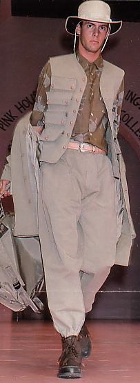 | ハンティングハット9,800円、サファリジャケット、サファリベスト、象のプリントシャツ、牛革アフリカベルト24,000円、コットンワークブーツ12,000円、ナイロンリュック11,000円。全身砂色。これぞ、典型的サファリスタイル! メンズは、レースのブラウスの代わりに、ゼブラやパンサー、象などのアフリカの動物のプリントシャツを。 メンズノンノ1989年2月号(No.33)「Tokyo Men’s Collection Spring−Summer ’89」 |