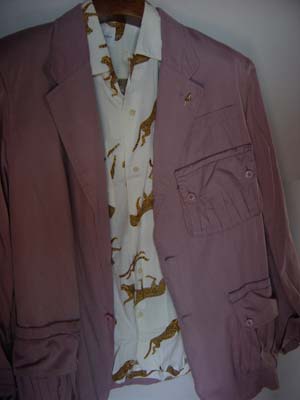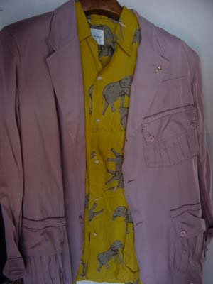 | 麻でカバーオール、胸ポケットにゼブラ刺繍というのが素晴らしい。予約してやっと買えたベージュ。絵型には白と黒もあったので、全国で探してもらいましたが、生産してなかったのか、買えませんでした(^-^:)セットアップのパンツや同素材の靴やバッグも揃っていて、個人的には増田宏則さんデザインの最高傑作だと思います。 シマウマ刺繍麻ジャケット¥46000、サファリ柄アロハシャツ¥20000、麻パンツ¥22000(カールヘルム1996年春物) |