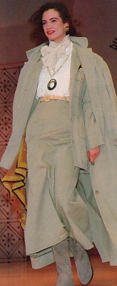 サファリジャケット33,000円、コットンコート50,000円、コットン開襟シャツ16,000円、コットンスカート16,000円、レースブラウス47,000円、パンサープリントスカーフ17,000、ロゴ入りペンダント10,000円、ロゴ入りブローチ6,000円、牛革メッシュベルト15,000円、スエードブーツ43,000円。ジャケットとコートの裏地はパンサー柄です。 Fashion Yearbook おしゃれ年鑑’89春夏編 1989年3月15日発行 |