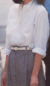 | ダンガリー素材のシャツやスカートが再人気です。ブルーのこのダンガリーは、はじめは労働者のためのシャツやパンツとして用いられたのです。それにアメリカ映画でみると刑務所の囚人達の制服でもあるようです。ロバート・レッドフォードは泥棒の役でもCIA諜報員の役でも監督のときでも、いつでもダンガリーシャツをご愛用。彼にとっても、便利な労働着なのでしょう。 さてそのダンガリーを労働着にしないで、ちょっと都会的にシックに着てしまうのが今年風。シャツも男物のタップリしたのを女の子が着るとかわいいし、スカートも白い少女のようなブラウスにパールのネックレスを合わせたらステキです。そして男はダンガリーシャツのボタンをきっちり止めて着るのがいいと思いませんか? で、そのシャツを着てくれたのがあの”トーキングへッズ”のデビッド・バーンです。セクシーなステージからは想像もつかないほどの物静かな好青年です。そのデビッドの大ファンだという小夜子さん。すこし上気した頬に白いブラウスとダンガリーのスカートが似合って、すてきなカップル登場になりました。 |