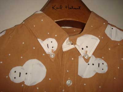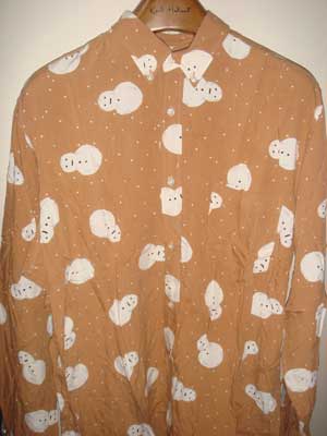 | ワンダフルハウスお気に入りのシャツを初公開いたします。1986年秋の雪だるま柄レーヨンプリントシャツ。衿に注目してください。雪だるまの顔とお腹が衿の左右にきています。このシャツは”大当たり”です!\(^○^)/ 上にジャケットを着てタイをしめても「雪ダルマのシャツだ」とわかるからです。色はベージュです。 | |