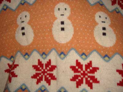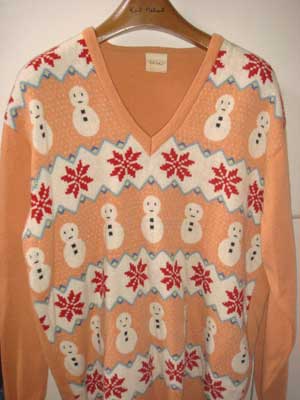 | 楽しいセーターの登場です。雪だるまと雪の結晶柄Vネックフェアアイルセーター。下の写真は、アンアン1989年10月13日号(No.695)に掲載されたカールヘルムの広告「コート三昧 僕のダンディズム」より。ワンダフルハウスのと同じオレンジです。他に黒、赤、ピンク、黄色、水色、グリーン、ベージュがありました。 | |