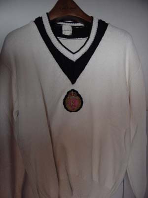 こういうオーソドックスなテニスの服装といえば必ず、チルデン・セーターなるものが出てくるのだ。たっぷりとあきをとったVネックの白いセーター。首と袖と腰にストライプの入った、おなじみのあれである。