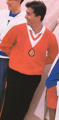 | 白地に黒のライン、ケーブル編みはVネックの黒い部分だけ。チルデン・セーターとしては非正統的なデザインですが、白い綿や麻のジャケット、ギンガムチェック・千鳥格子・グレンチェックのモノトーンのジャケットやスーツとの相性は抜群です。 | 当時メンズクラブの専属モデルだった田中カールさんが赤を着ていました。 |