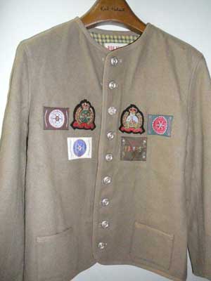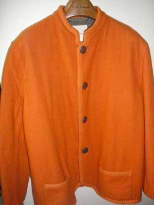 | ワンダフルハウスが長年に渡って秘蔵していたチロリアンジャケットを公開いたします。上の写真1と同じ物で、こちらは、当ホームページのお客様で、長沢節先生自筆のイラストをお持ちのセツモードセミナーOBの方から、何冊かの古いアンアンと共に譲っていただきました。この方は、堀内誠一さんが世田谷に住んでいた頃、同じマンションに住み、堀内さんの奥様やお嬢様とも交流をお持ちだった凄い人でした。その方も「洋服を沢山持っている、デザイナーの友人からいただいた」そうです(金子さんではないそうです)。いただいた時点で、エンブレムとワッペンは外されていたとのこと。たぶん、あまりにも派手で、着るのに抵抗があって外してしまったのでしょう。当時、カールヘルムの販売員をしていた人に見せたら、「オレンジなんて作ってたんですね!」と驚いていました。オレンジは生産数が少なかっらしく、現存している物は、これ1着と思われる大変貴重な服です。 | |