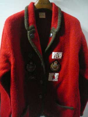 | 上の写真2と色違いの赤。ヨーロッパのスタンダードアイテムとして、昔からアイビールック愛好者に人気が高かった、毛糸で編まれたチロリアンジャケット。年齢、性別、体型を問わずに誰もが似合う、まさにニットジャケットの王様のような代物です。 | |