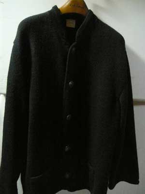 | こちらは、7年後の1993年に発売されたニットのスタンドカラータイプのチロリアンジャケット。パイピングも黒なので、全体的に真っ黒。何にでもコーディネートできる、着こなしやすいジャケットです。ボタンは上の方で使われているものと同じマリア・テレジア柄。 |