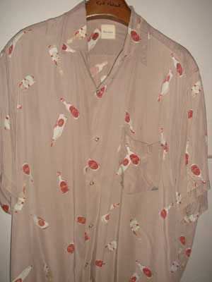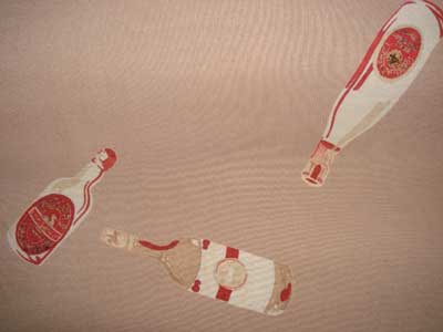 渋いピンク色のアロハです。こういう可愛い感じのボトル柄も、色使いでグンと大人っぽく見えることもあります。紺、グレー、赤、ピンク、水色、グリーン、ベージュ、ワインの8色展開でした。なんとワイン色もあったのですね。