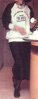 「PINK HOUSE SHIMPA CLUB」のロゴ入り。ユリさんのトレーナー姿は大変珍しい。’83年の11月に完成した新居のダイニングキッチンで。一日のほとんどをここで過ごしていた…クロワッサン1984年4月10日号