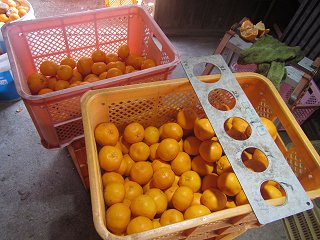 はるみのL〜Sサイズの出荷が24日にあり、前日23日に選果を行った。大玉や小玉の特別集荷があるが、我家では残り全てを個配に回す予定だ。過去にも記したが、今年のはるみは、これまでに経験したことの無い酸抜けの遅さだ。更に酸が抜けても食味が例年並みにならない。家だけかと思って複数の友人に訪ねると皆同じ傾向だった。てことは自然…昨年の異常高温や水不足など、思い当る節が頭に浮かぶ。田んぼは、川の水で例年以上の灌水を試みたが、連日の35℃超は避けようがなかった…。 写真はL〜Sサイズ(温州ミカンより1サイズ大きい)をゲージを使って選別している様子。はるみはこの時期になると腐敗しやすいため、選果台でゴロゴロ転がすのを控えている。収穫が年明けになり、年明けの霜に当たっていることもあって、前面は綺麗でもヘタ側が痛んで果皮障害果になっている果が多く苦慮。おまけに食味が例年に及ばないとなると、多量の選果落ち果を今一度熟成して味を整えるしか方法が無い。収穫し、粗選果以降もコンテナに入っていたはるみを、24日のJA出荷後、モロブタへ空け再熟成体制をとった。今週中にはOrangeVillageより個配の頒布案内をする予定でいる。食味相応の値をどう付けるか悩ましい。 |