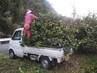 生活の拠点を名古屋から清水へ移した後に、親父とカミサンが田んぼの南に早生ミカンの苗木を定植させた。なので今でもその辺りを「田んぼの小木群」と呼んでいる。しかし15年以上経つと小木は成木になり立派なミカンの木になった。ところが、当初より成長を見て間伐するつもりだったが、毎年剪定で済ませていた。昨年は緊急入院をする身になったことも手伝い、殆ど剪定も出来ずに時が流れた。樹間は農薬散布・施肥・草刈り・収穫と、どれをとっても行き届かないジャングルに近い状態になった。陽当たりも風通しも悪く、納得の行くミカンなど採れる訳がない。何より作業が大変で年寄りには辛い。ずっとそう思っていたが抜本的な対策が出来ないままだった。分かっていてもやらなかったのだ。それでここに来てようやく重い腰が上がった。量より質と環境改善を目指そう!と。 写真は伐採した成木を軽トラに積んで大峰のヒノキ林へ廃棄に向かう準備。カミサンが軽トラの荷台に上り勇ましい。これを一日やっても3往復、終わるまで数日かかりそうだ。オンマウスは大峰中腹の農道で遭遇した子連れのニホンザル。天気も良く、10匹程が我がもの顔でかっ歩し竹藪へ消えた。 |