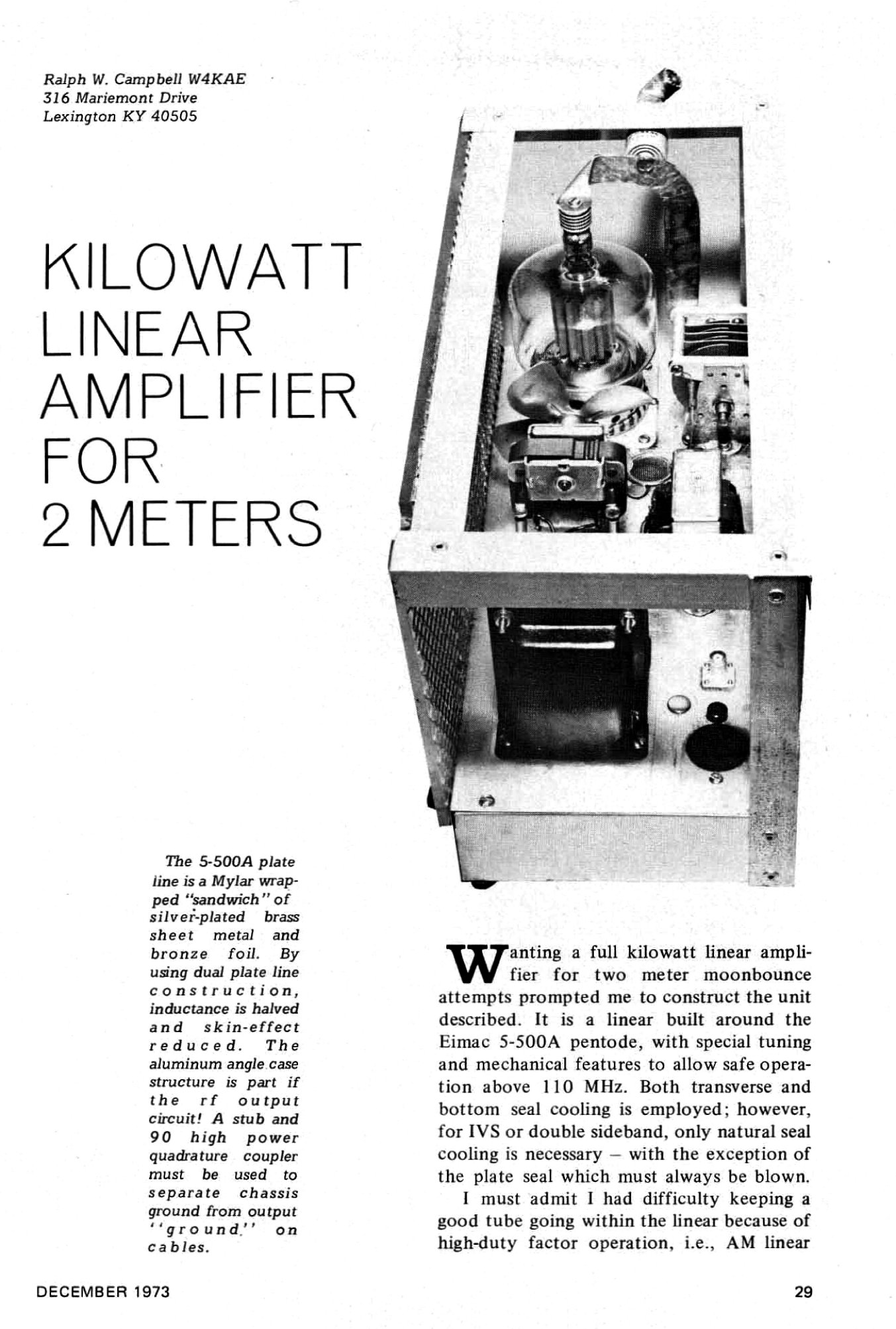 されていた。用件はその後追加したスイッチについての質問だった。1997年頃の製作なので、記憶が曖昧なため工房へ赴き、未だに電源の入るこのアンプの写真を撮って来た。その写真を元に説明を返信したが、ことのついでにW4KAE/Ralphが73誌1973年12月号(31頁)に寄稿した5-500A/144MHzアンプ記事のコピーを送った。その後、ご尊父は90代でご健在のVK4VV(exVK8VV)で、6mで多くのJAと交信していたと判明。こちらもカミサンのコールや55周年記念QSLを送るなどして盛り上がった。ところで彼は、既に3-500Zを香港の業者へ注文し、来週の到着を待っているらしい。ご尊父の助言もある様で、どうやら本気の様子だ。先日のSP5CUR/Lukasもそうだが、このデジタル時代に四半世紀以上前の怪しい記事を見つけ出し、参考にしようとする気概に驚く。まさに温故知新じゃないか…。恐らくkWレベルの自己発振や寄生発振に遭遇するだろうが、それを経験するだけでも損はない筈だ。 写真は、2014年撮影の3-500Z/144MHzアンプ。オンマウス(クリックで拡大)はW4KAEの記事のトップ頁…この記事には随分と勇気付けられた。 |
