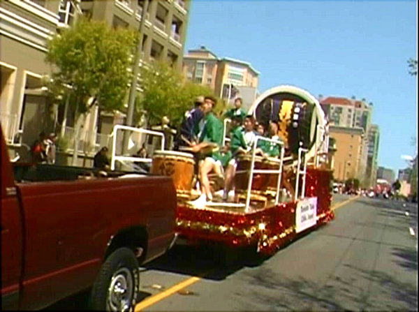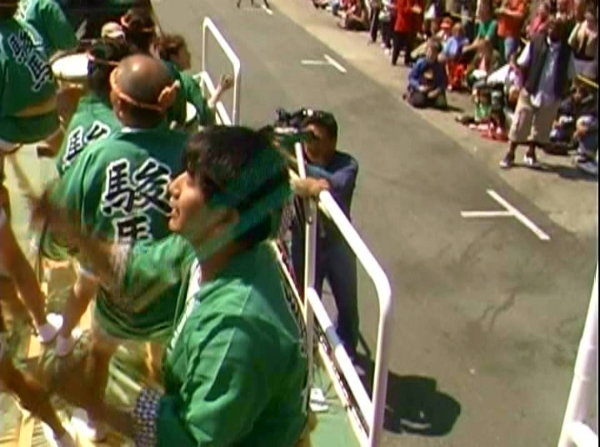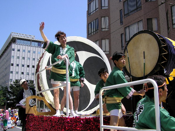 大きな台車の上で演奏しながら車で引っ張ってもらって